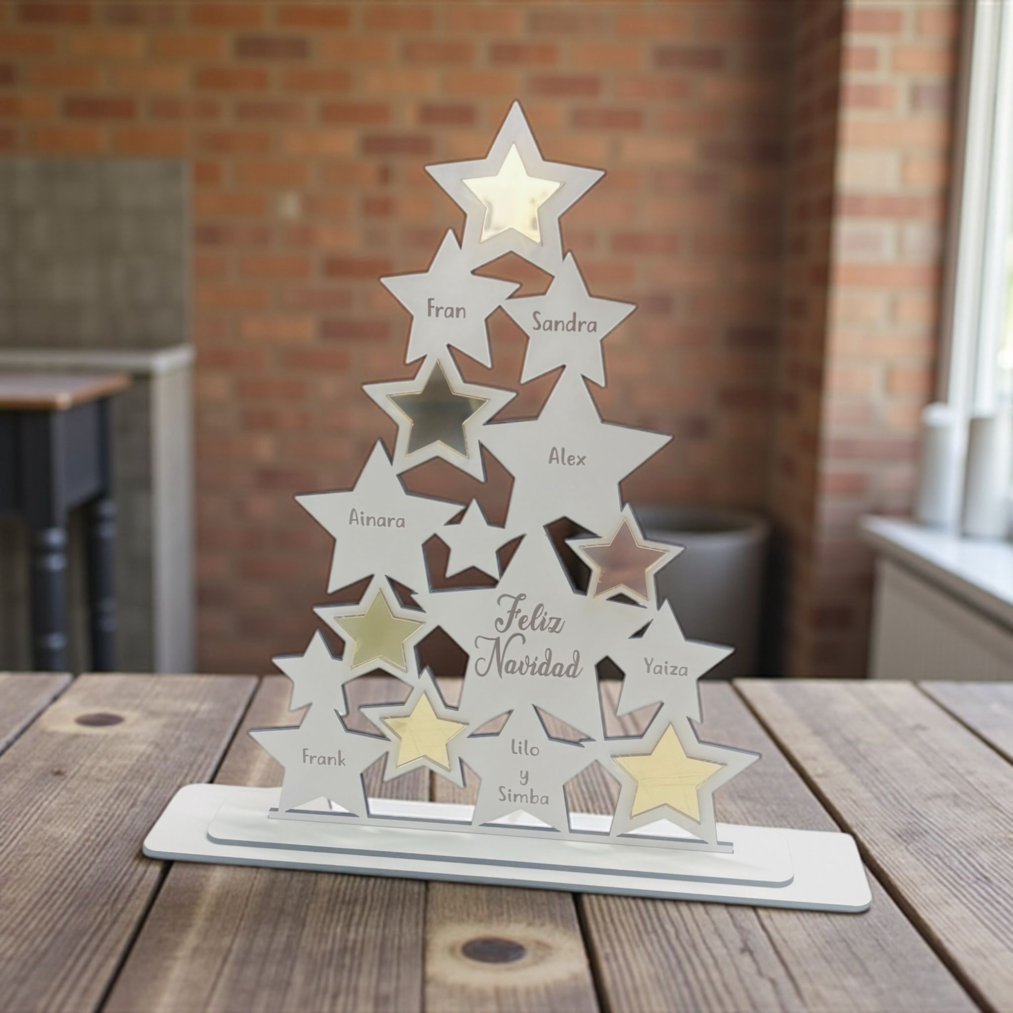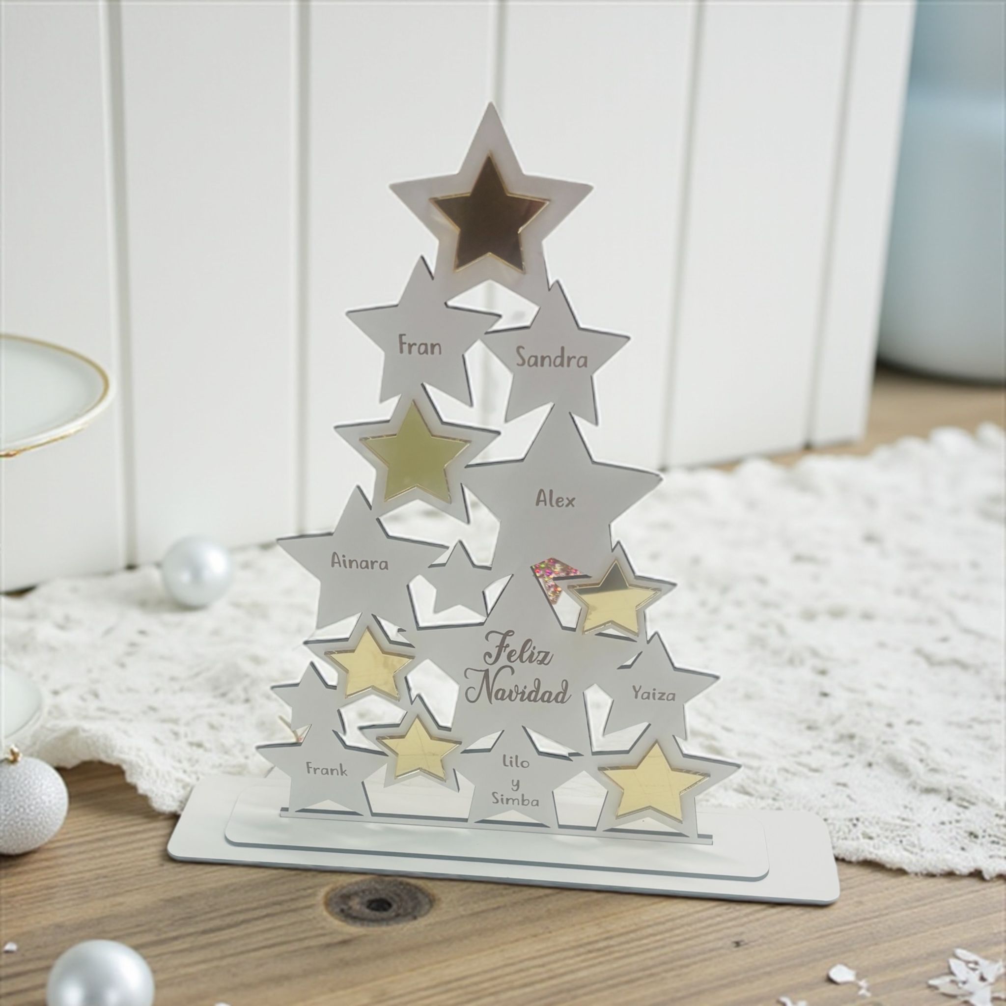 Decora tu hogar esta Navidad con el arbol estrellas con nombres, un encantador árbol de madera blanca que aporta magia y significado a cualquier rincón. Este detalle navideño es perfecto para crear una decoración única y personalizada.