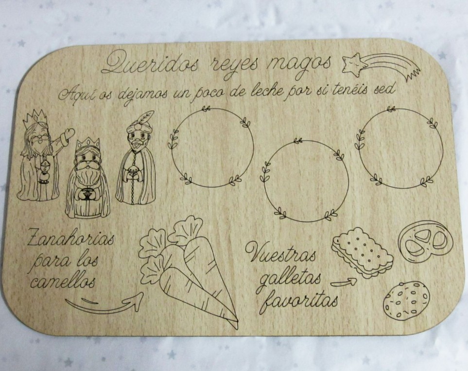 Bandeja Reyes Magos de Oriente en madera laminada de 3mm. Tamaño 280x190mm.