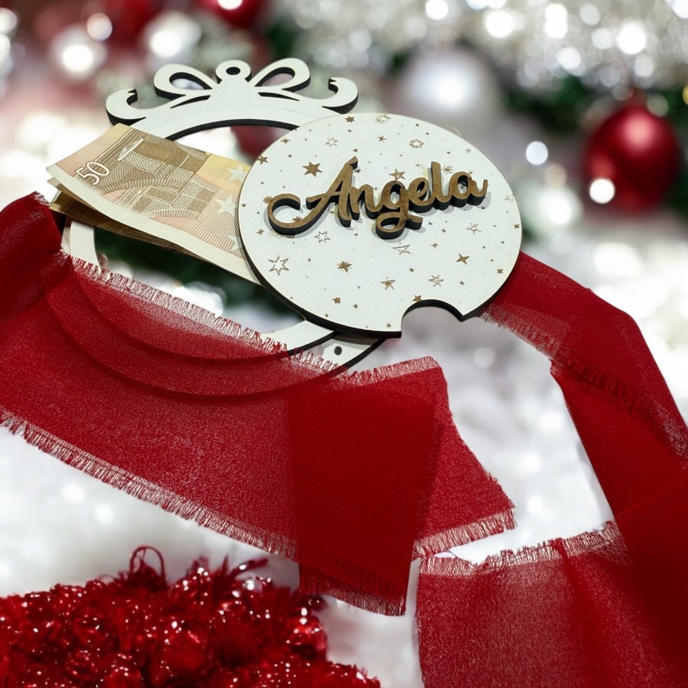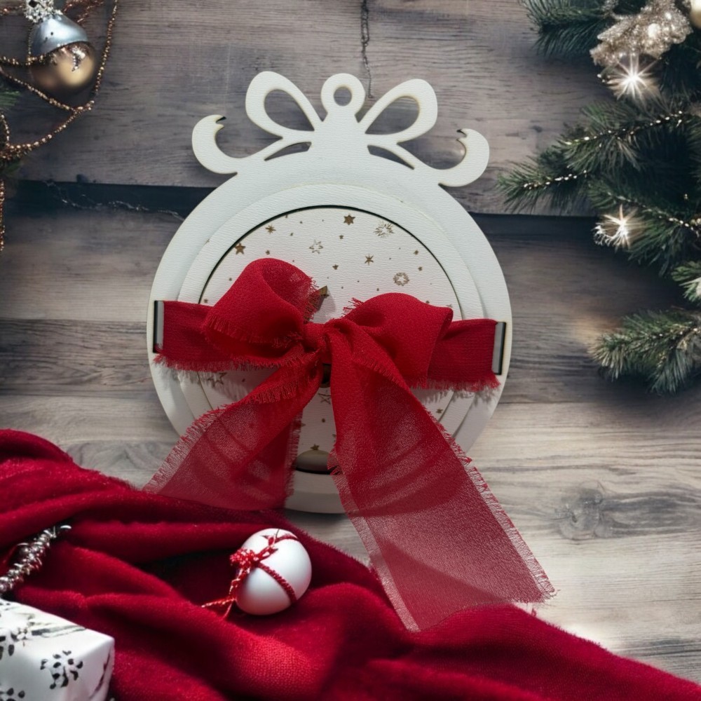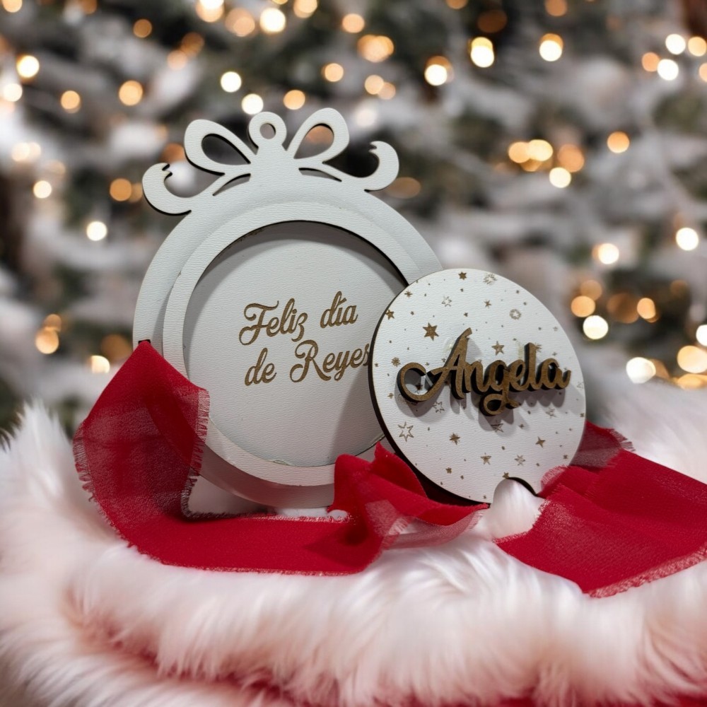 Bola de madera para el árbol, personalizable con un mensaje interior y diseñada para incluir un donativo.