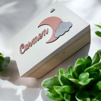 caja luna personalizada es el detalle perfecto para bautizos y celebraciones especiales. Esta elegante caja de madera destaca por su diseño exclusivo, con una tapa pintada a mano que incluye un nombre en relieve y una delicada luna, creando un accesorio decorativo lleno de encanto.