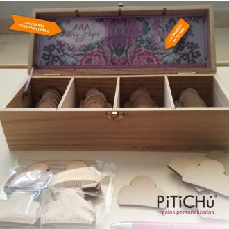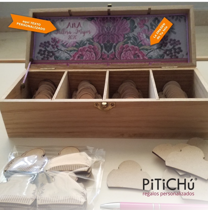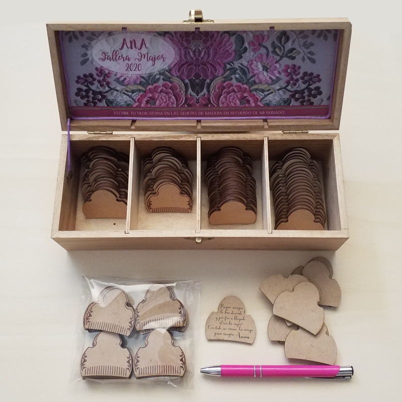 Caja de firmas de madera natural, para personalizar y contenedora de siluetas de madera con forma de peineta o petardo para escribir dedicatorias.