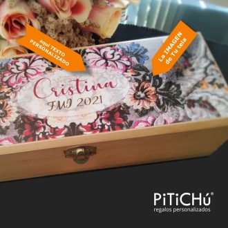 El interior de la tapa también está personalizado e incorpora una frase que invita a que todos escriban una dedicatoria y la firmen para ti en recuerdo de ese día, el día de tu exposición del traje, el de tu presentación, el de tu vino de honor, … el día que tu decidas.