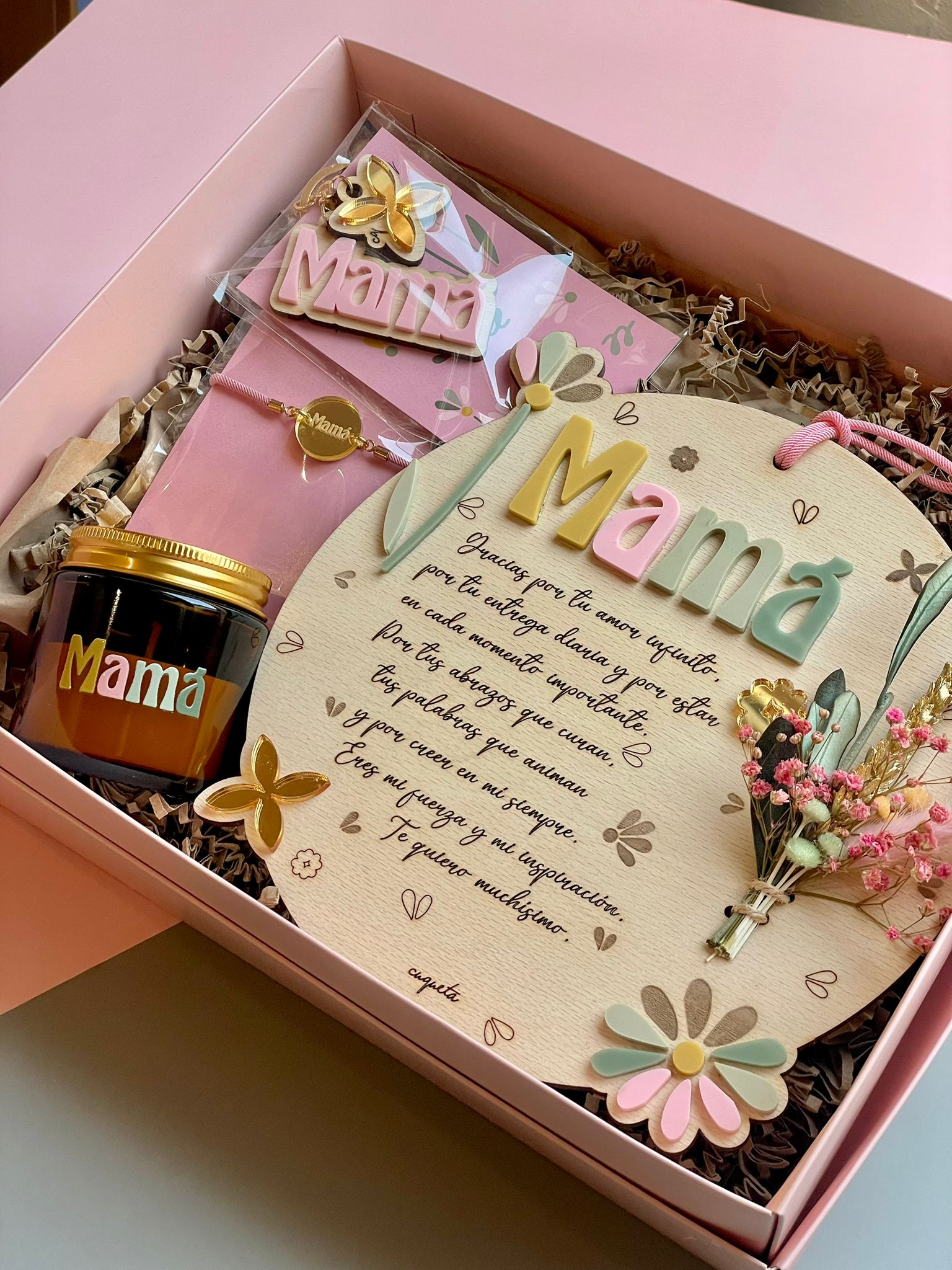 Box de regalo LOVE «Mamá» compuesta por placa dedicatoria de la colección Día de la Madre 2026, vela perfumada, pulsera de Mamá y llavero de la misma colección.