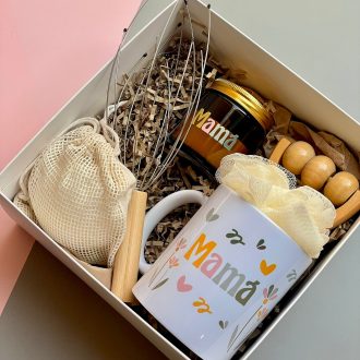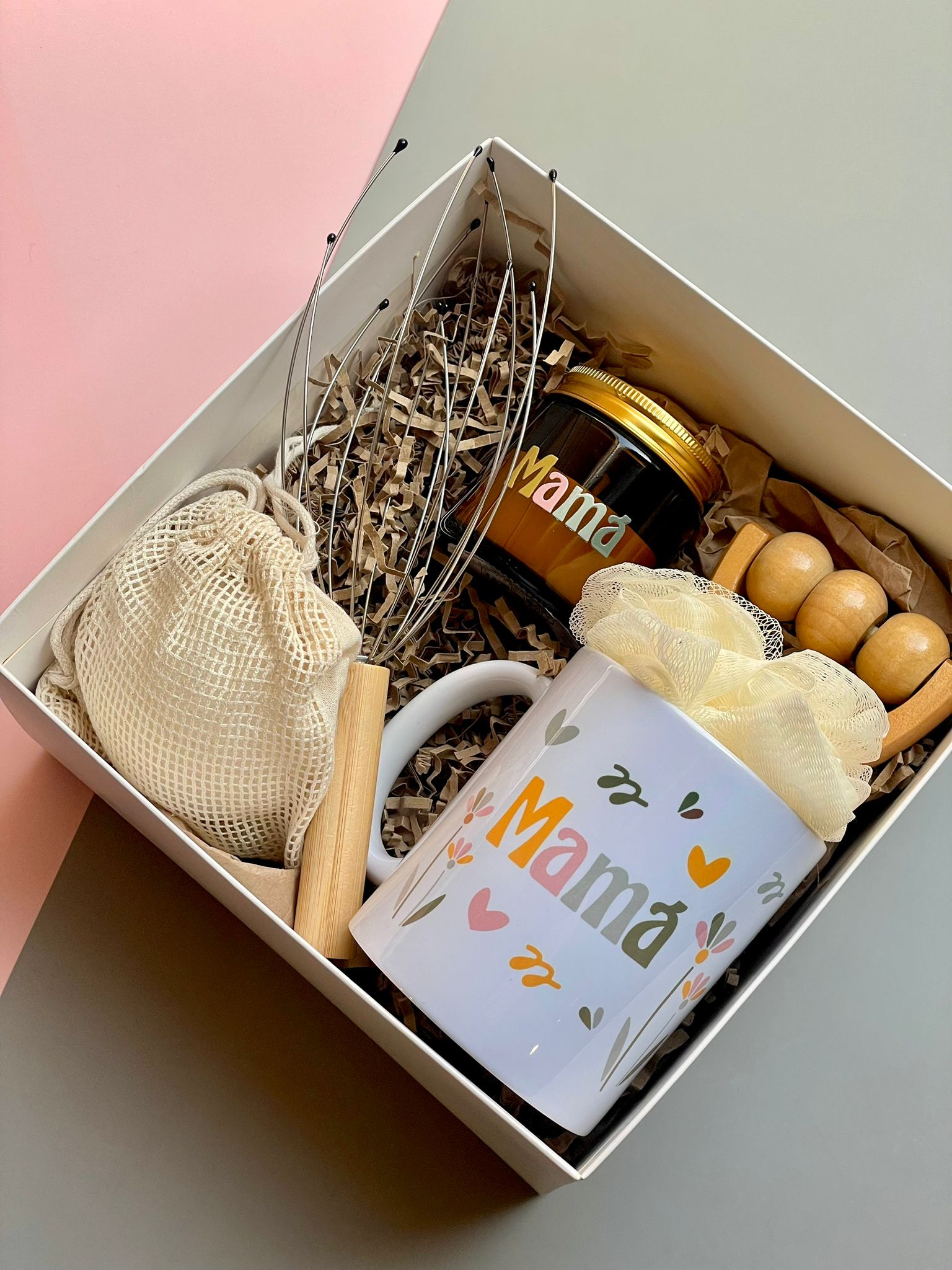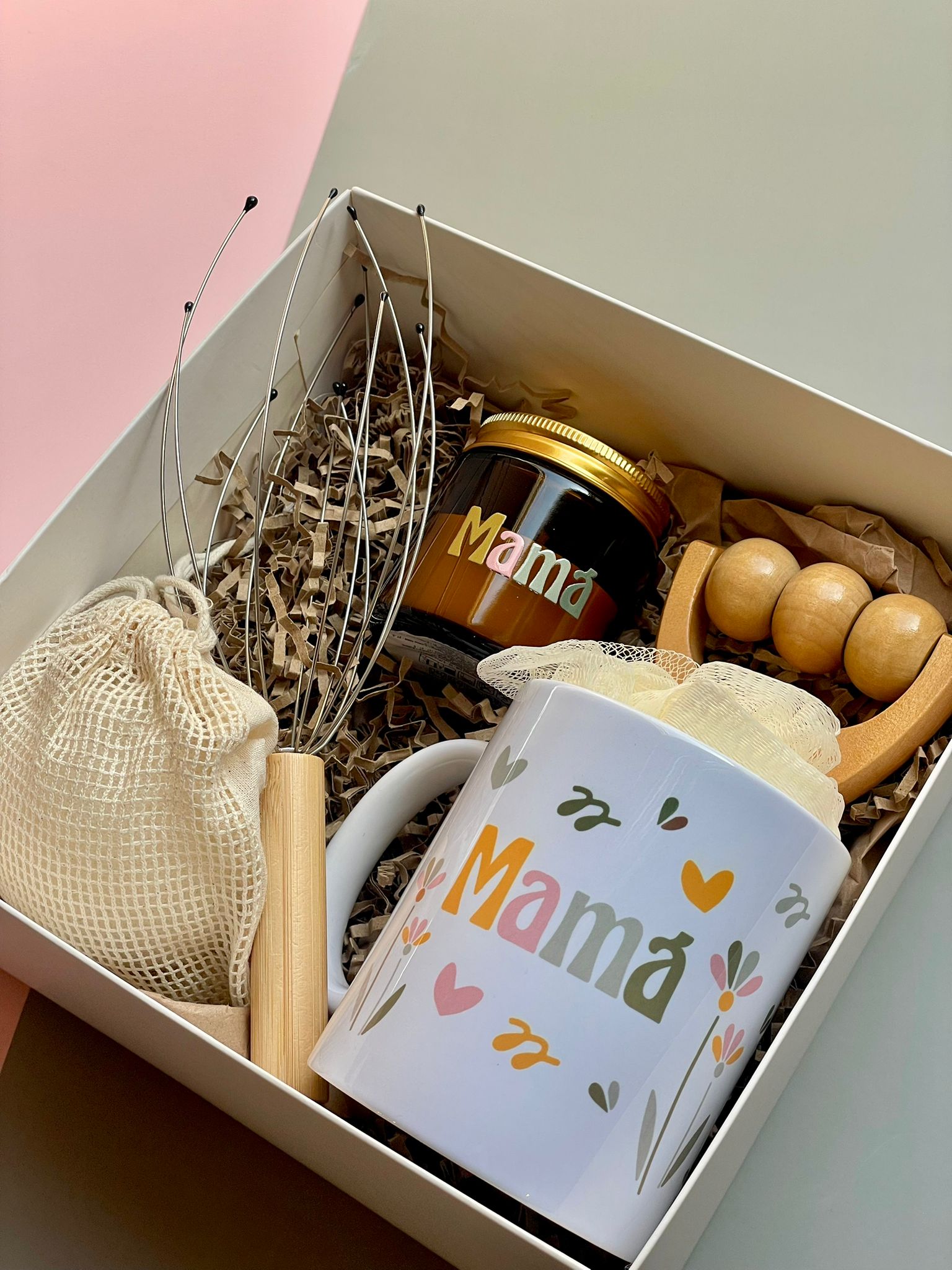 Box de regalo RELAX «Mamá» compuesta por esponja de baño, rodillo de masaje en madera, taza, vela aromática, exfoliador y masajeador craneal.