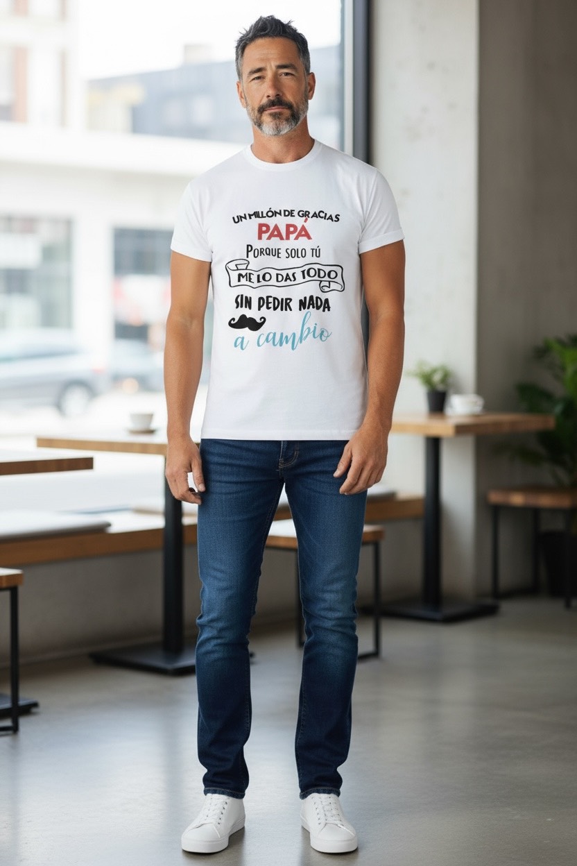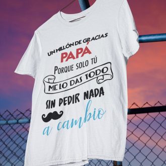 En este Día del Padre, haz que tu padre se sienta especial con la Camiseta Un millón de gracias papá. Este regalo único no solo le hará sonreír, sino que también le recordará el amor que le tienes cada vez que la use. Personaliza la tuya y sorpréndele con un detalle que nunca olvidará.