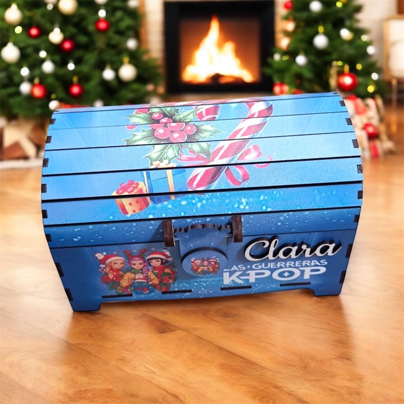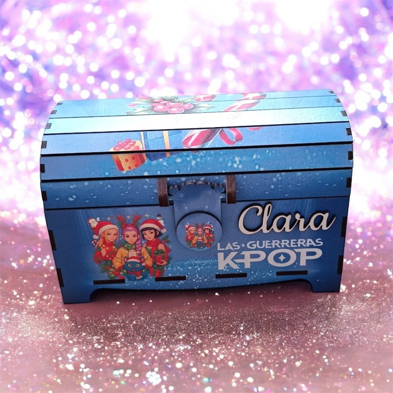 En este modelo, el cofre está decorado con un diseño exclusivo inspirado en las guerreras K-pop, lleno de color, energía y ritmo, ideal para las fans de este universo vibrante y moderno. Además, podrás personalizarlo con el nombre que elijas, convirtiéndolo en un recuerdo original y único.