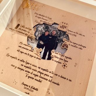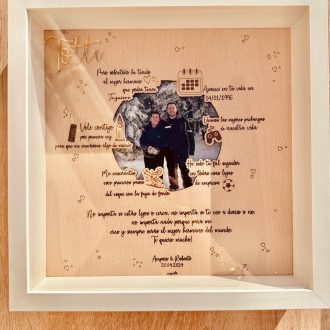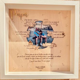 Descubre el cuadro nuestra historia personalizado, el regalo ideal para el Día del Padre. Este exclusivo cuadro, con un elegante marco blanco, está elaborado en una hermosa lámina de madera de haya de 25×25 cm. Es una forma única de celebrar momentos inolvidables junto a tu ser querido.