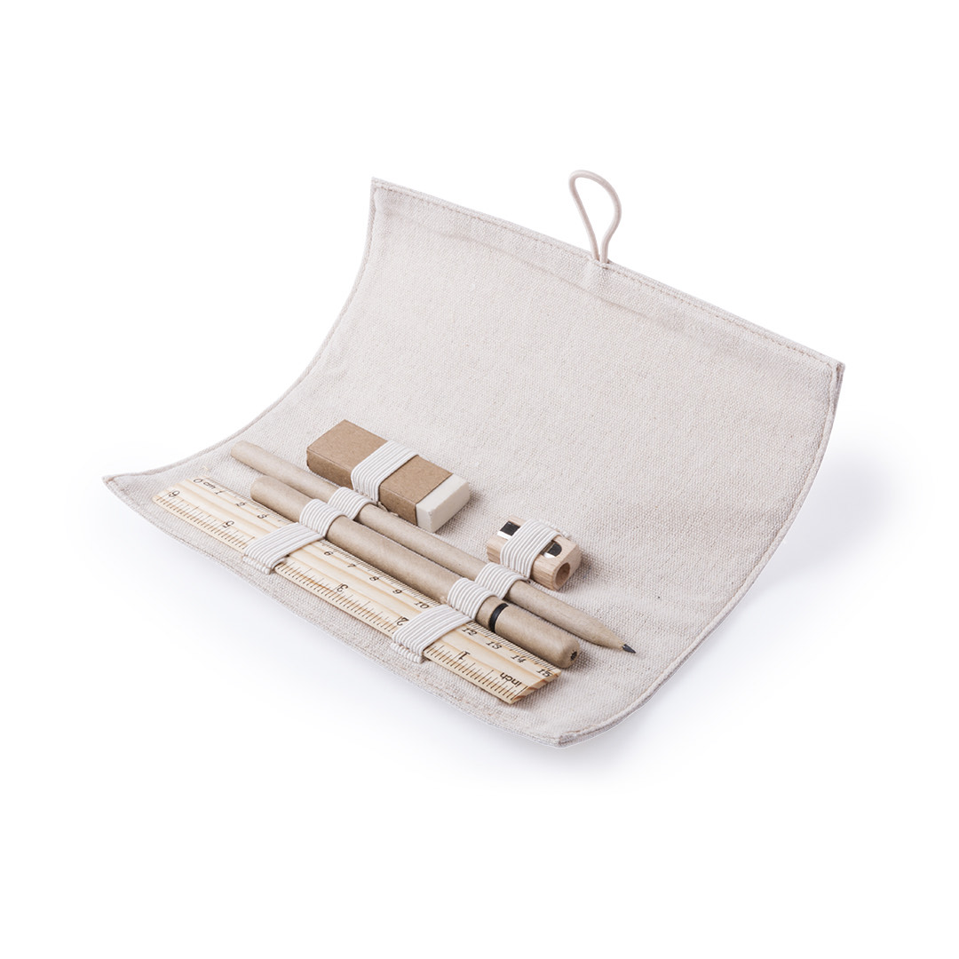 Original estuche de línea nature. Fabricado en yute y algodón, con elegante cierre de botón. Contiene 5 piezas de acabado nature: Goma de borrar, sacapuntas y bolígrafo de cartón reciclado, con lápiz y regla de madera.