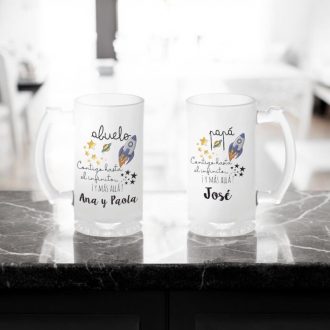 Esta jarra de cerveza esmerilada es perfecta para disfrutar de esos momentos memorables en familia o con amigos. ¡Imagina a tu abuelo brindando con su bebida favorita mientras muestra su jarra personalizada! La Jarra Abuelo contigo hasta el infinito y más allá se convierte en un símbolo de conexión y recuerdos compartidos.