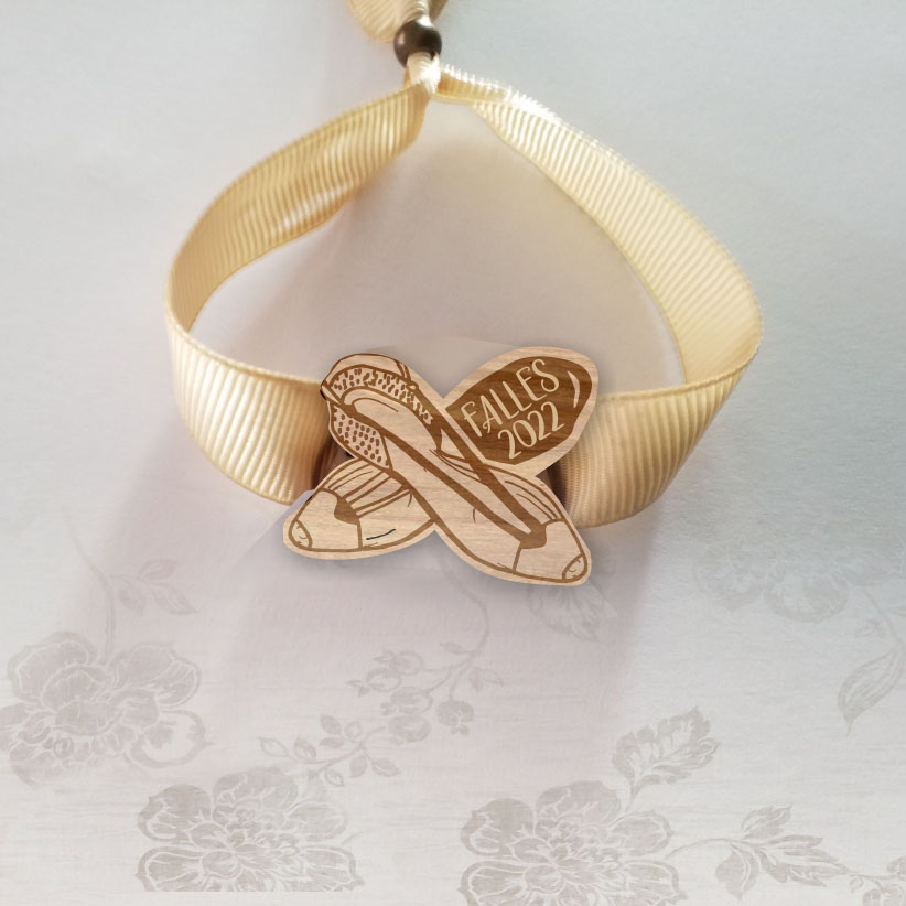 - Pulsera con espardenya de madera con grabado del texto “falles 20…” (año de tu reinado)
