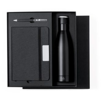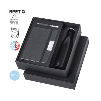 Bidón Térmico Acero Inox Reciclado, 500 ml. Bloc Poliéster 300D RPET, Portada Rígida, 80 Hojas. Bolígrafo Poliéster 300D RPET