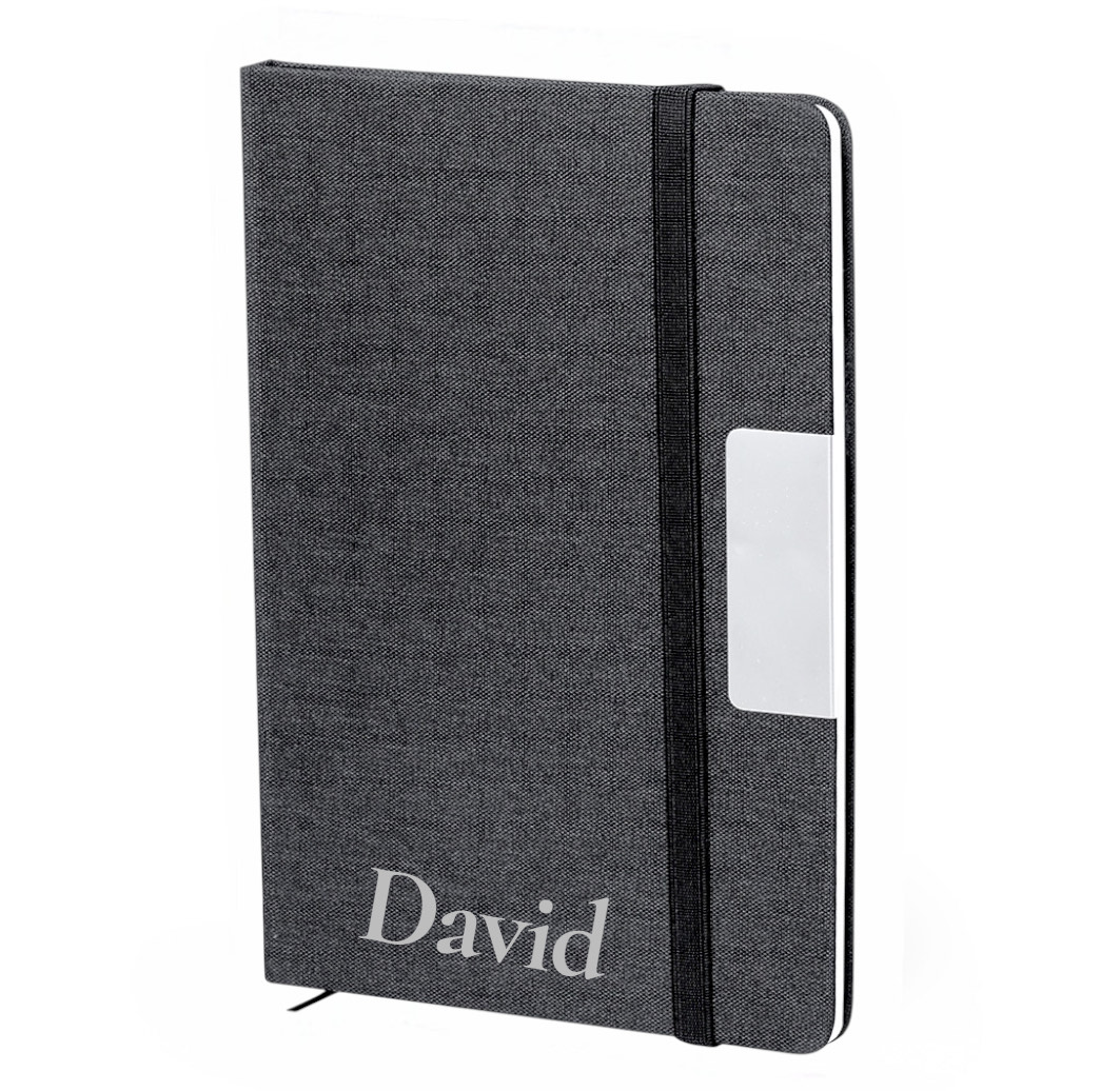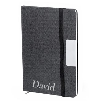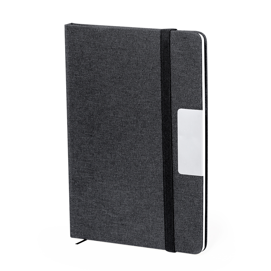 Bloc de notas en RPET en elegante color negro, con detalle metálico especial para marcaje en láser. Incluye cierre elástico y marcapáginas de tela. Interior con 80 hojas de disposición a una raya. Con logotipo RPET.