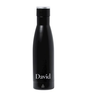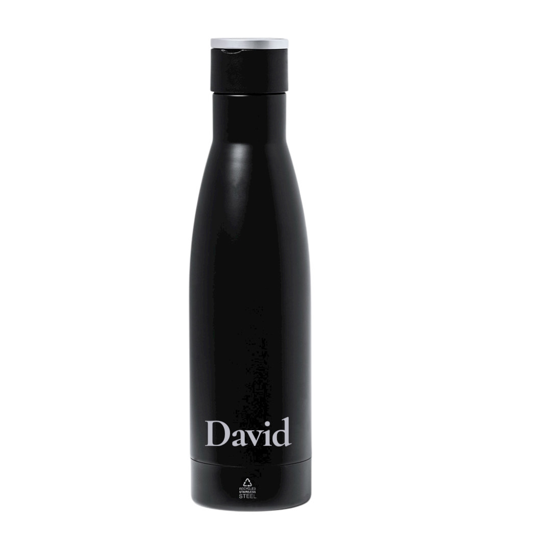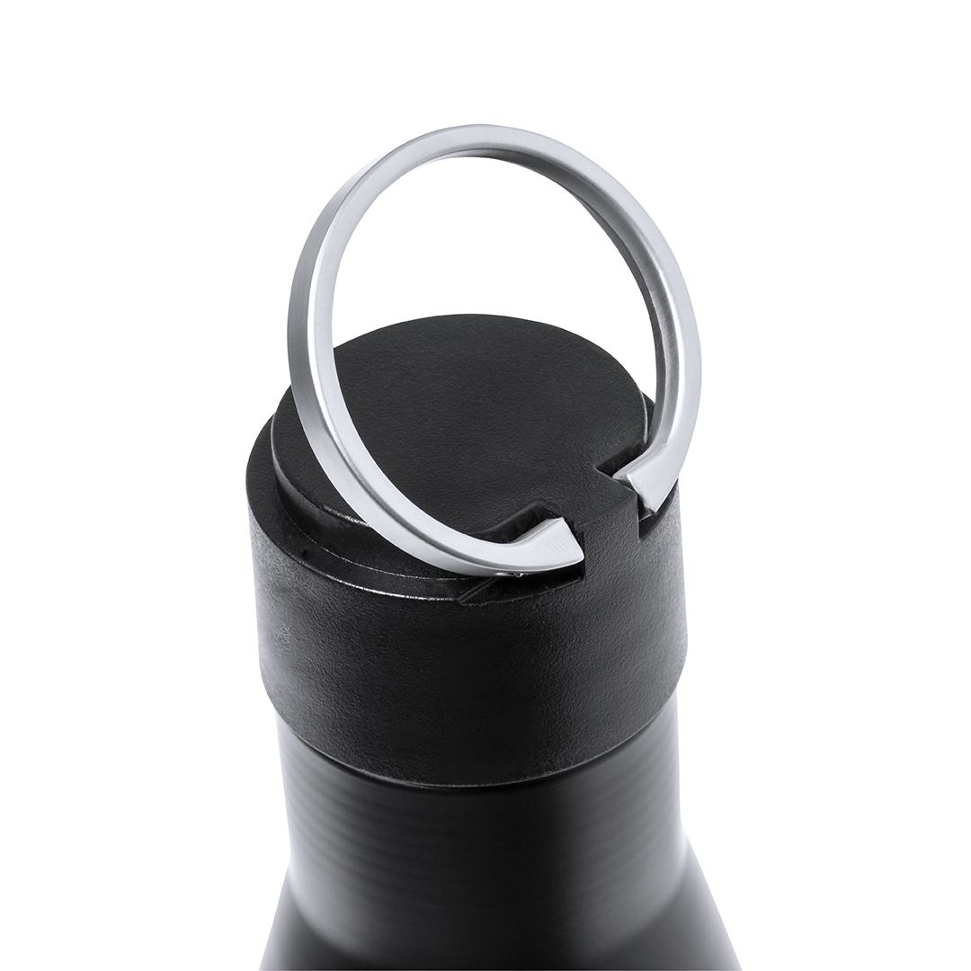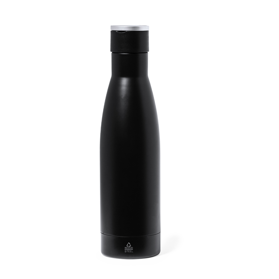 Termo de doble capa en Acero Inox Reciclado de acabado negro mate y de 500 ml de capacidad, con asa rígida de metal color plata mate. Con logotipo acero inox.