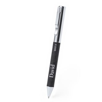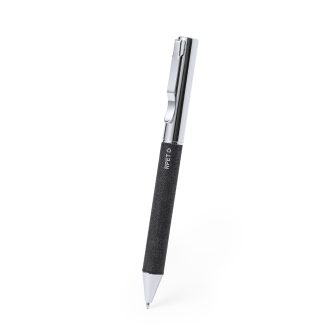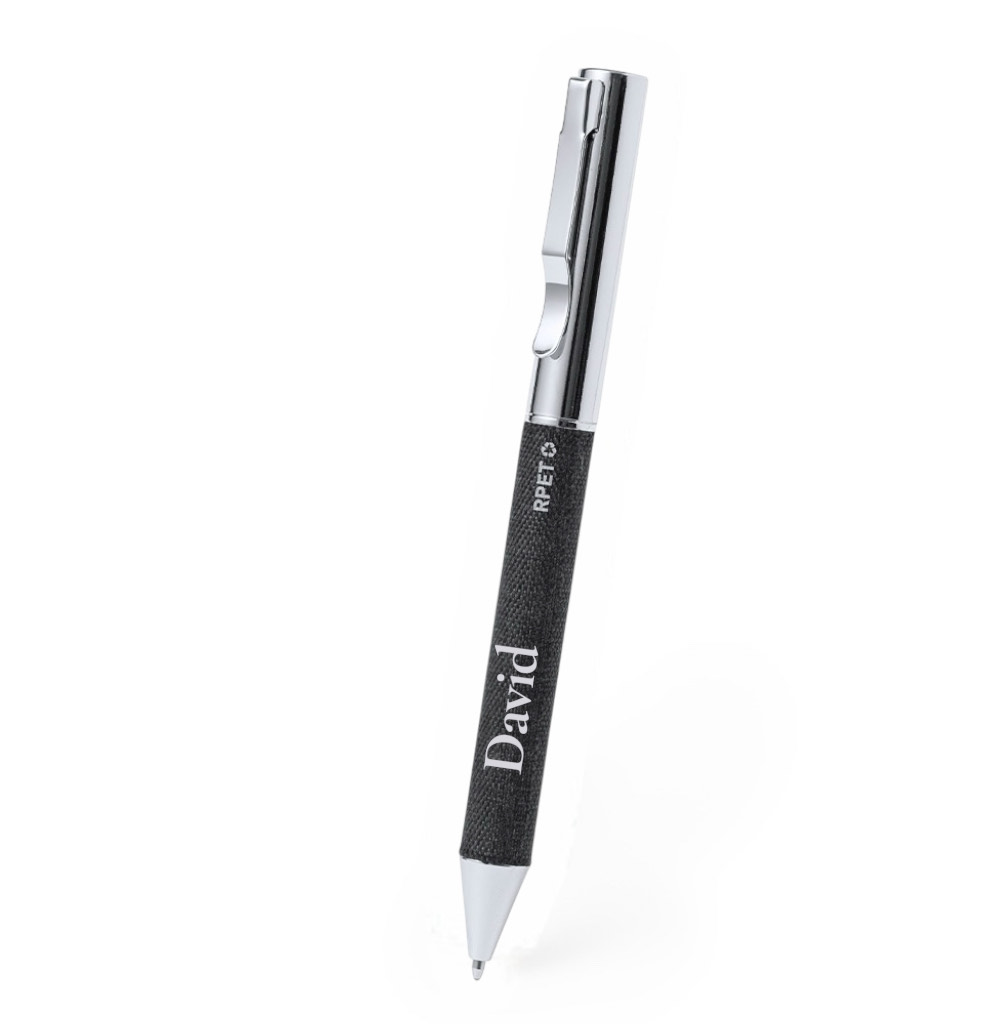 Bolígrafo en RPET de acabado negro mate, de mecanismo giratorio y tinta azul. Con clip y puntera en pulido metal.